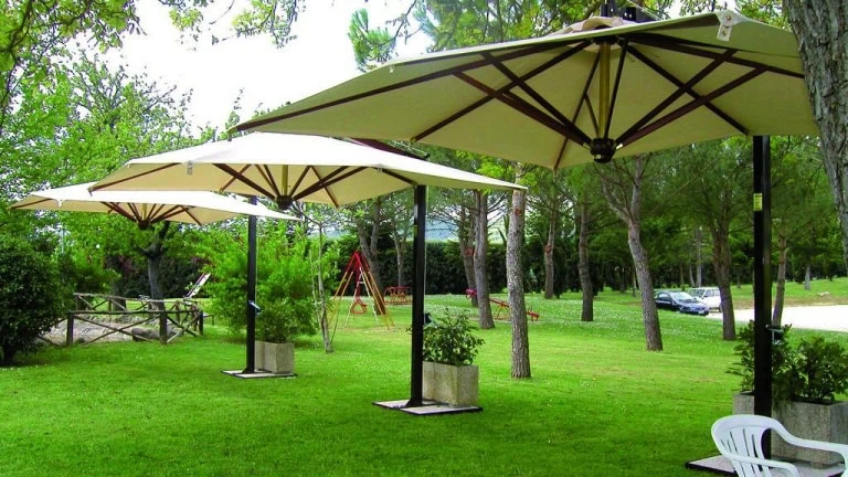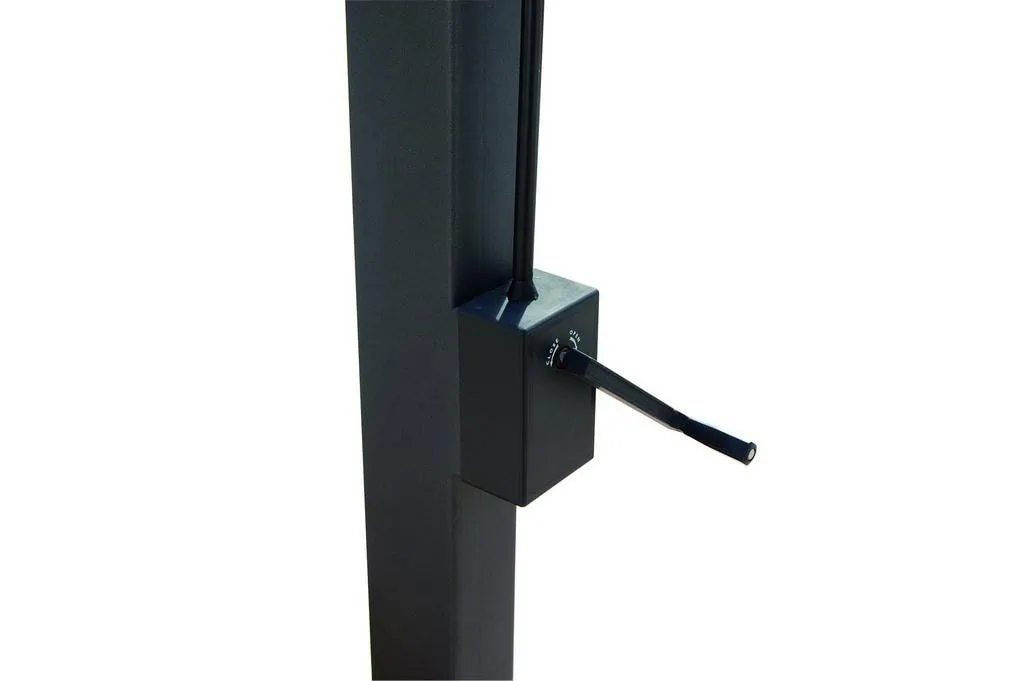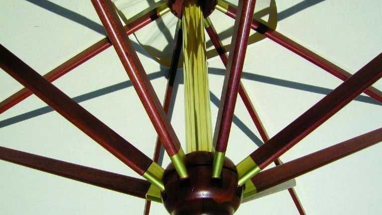Ombrellone a palo laterale con le stesse caratteristiche dell’America Brazil con l’aggiunta dei requisiti e dell’eleganza del modello Elite, dati dai rinforzi in ottone e il legno mogano.