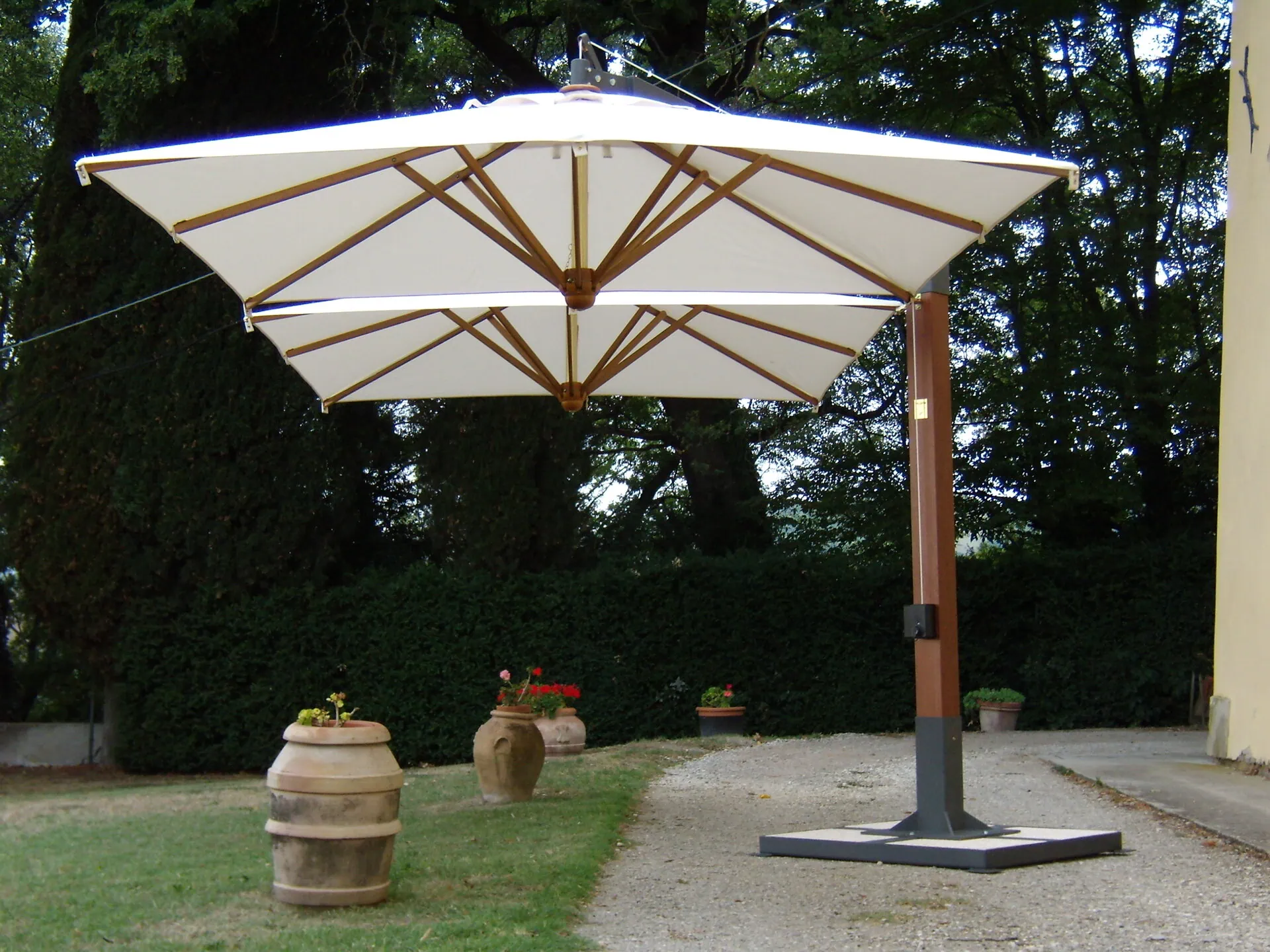 Grazie al palo decentrato, l’area sottostante rimane completamente libera, consentendo una disposizione più funzionale di tavoli, arredi e zone relax. La struttura è progettata per assicurare massima stabilità, anche in caso di utilizzo intensivo e in contesti professionali come hotel, ristoranti, stabilimenti balneari, dehors, terrazze e giardini, oltre che in ambienti residenziali di pregio.
