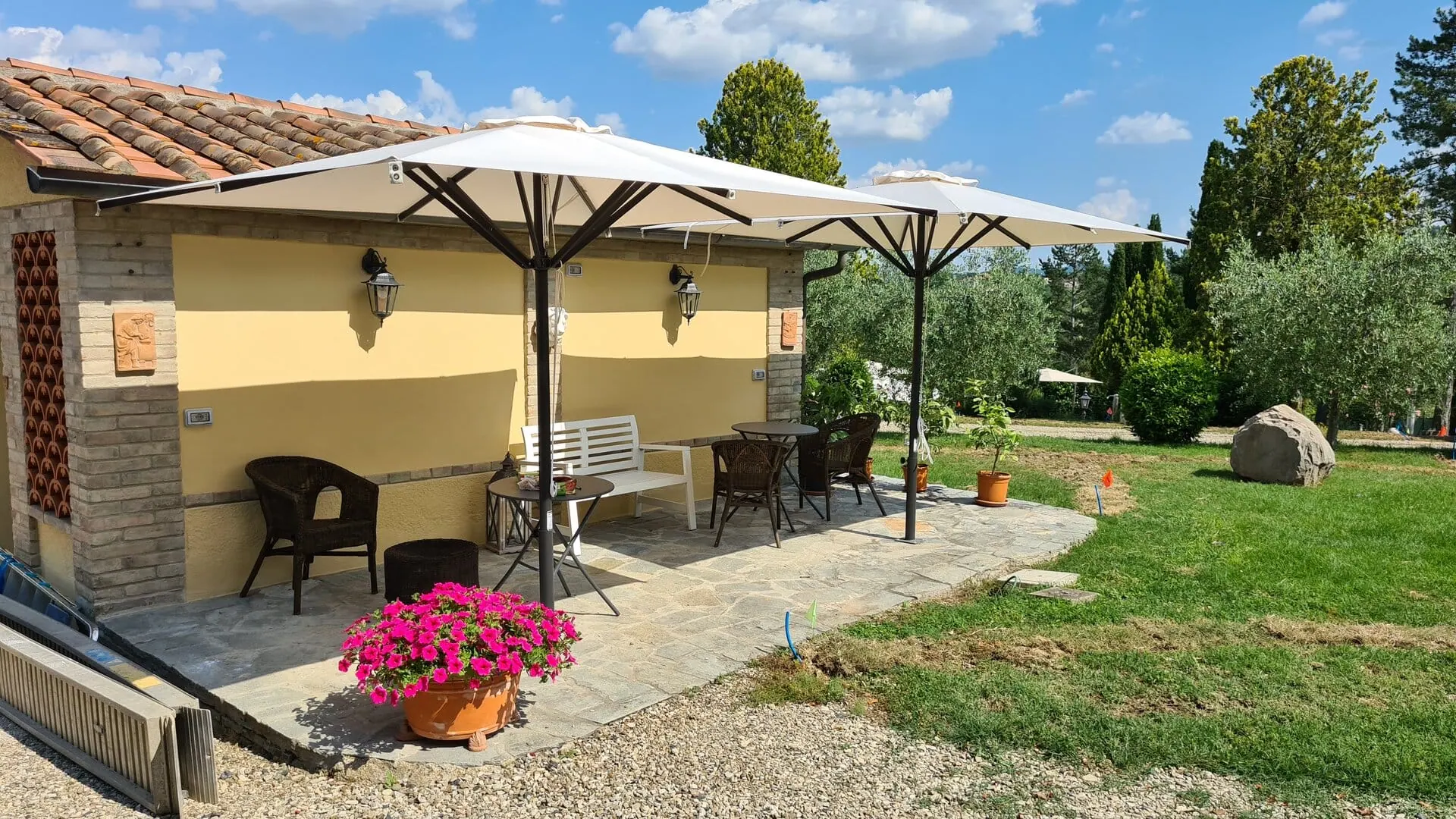 Pannelli laterali di chiusura in tessuto acrilico e crystal H 2400 mm con sistema battipioggia. Aste telescopiche per la stabilità della struttura. Porta di ingresso avvolgibile.