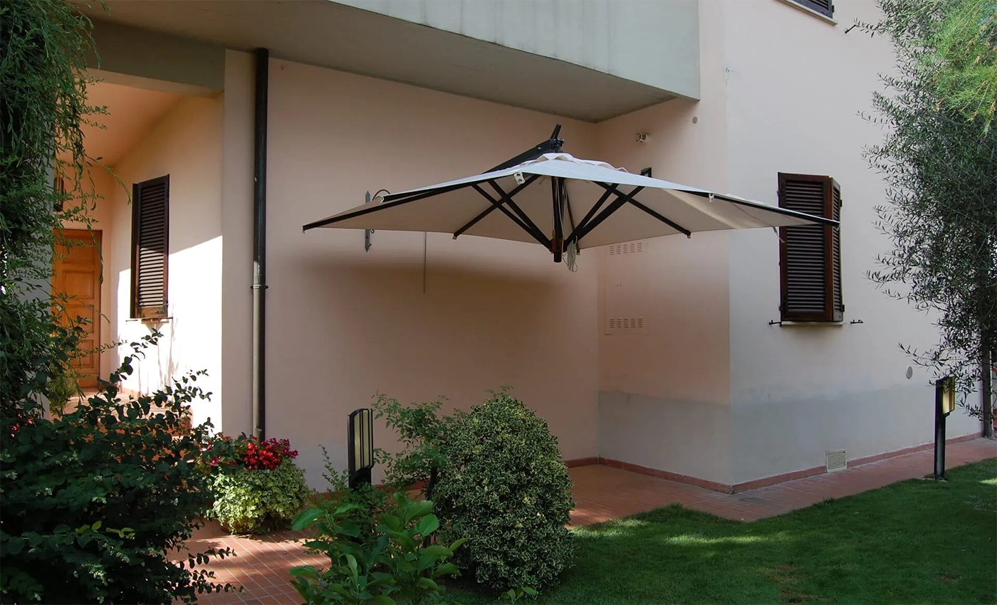 Un punto di forza distintivo è il pratico sistema a cerniera, che consente di accostare facilmente l’ombrellone al muro quando non è in uso. Questa caratteristica lo rende particolarmente funzionale in contesti contract ad alta densità, ma anche in spazi privati compatti, dove l’ottimizzazione dello spazio è fondamentale.